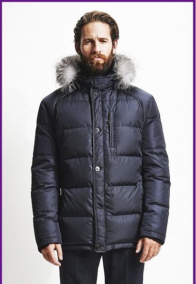 Стеганый теплый, зимний пуховик представительского класса, сложного темно-синего цвета (navy), с еле заметным цифровым принтом "елочка", нанесенным с помощью высокотехнологичного лазерного оборудования, с отделкой из натуральной кожи.